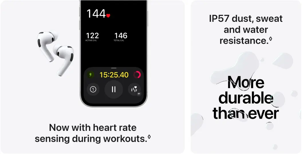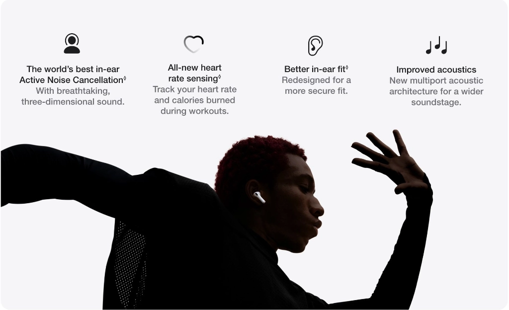 Now with up to 2x more Active Noise Cancellation than AirPods Pro 2.◊ Refer to legal disclaimers.Exceptional sound quality. All‑new heart rate sensing during workouts.◊ Refer to legal disclaimers.A more secure in‑ear fit.◊ Refer to legal disclaimers.IP57 dust, sweat and water resistance.◊ Refer to legal disclaimers.Advancements in hearing health.◊ Refer to legal disclaimers.Live Translation to communicate across languages.◊ Refer to legal disclaimers.And improved battery life with up to 8 hours of Active Noise Cancellation on a single charge.◊