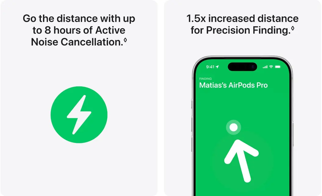 - 1.5x Find My with Precision Finding: Compared with AirPods Pro 2. Improved Precision Finding requires iPhone 17 and AirPods Pro 3; availability varies by region.