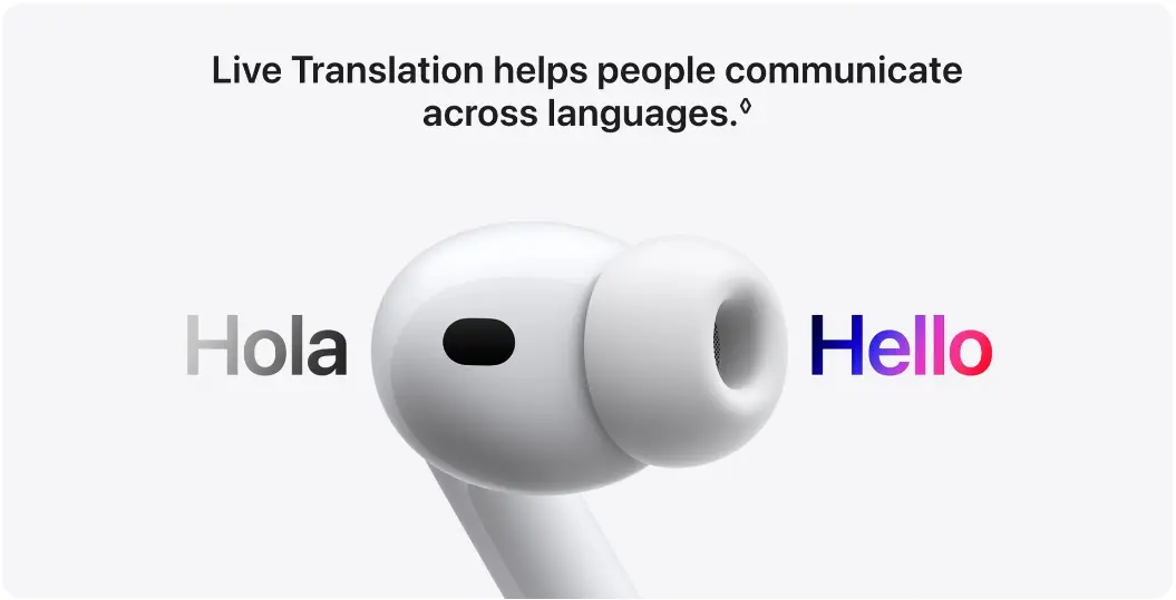 - Live Translation: Live Translation with AirPods works on AirPods 4 with Active Noise Cancellation and AirPods Pro 2 and later with the latest firmware when paired with an Apple Intelligence‑enabled iPhone running iOS 26 and later. Supports English (UK, U.S.), French (France), German, Portuguese (Brazil) and Spanish (Spain). For more information, see apple.com/ca/ios/feature‑availability.