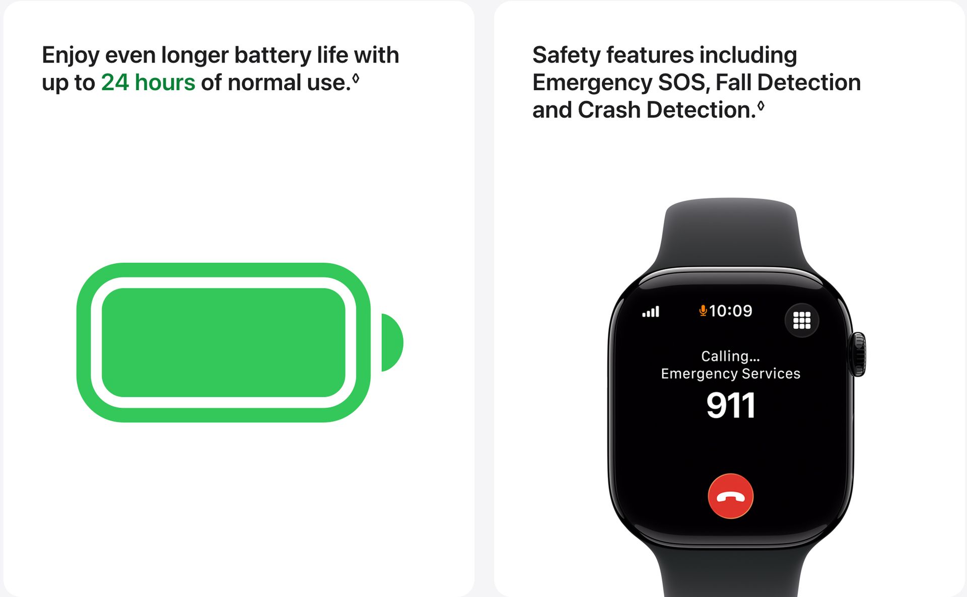 Power and Battery: Battery life varies by use and configuration. See apple.com/ca/watch/battery for more information.