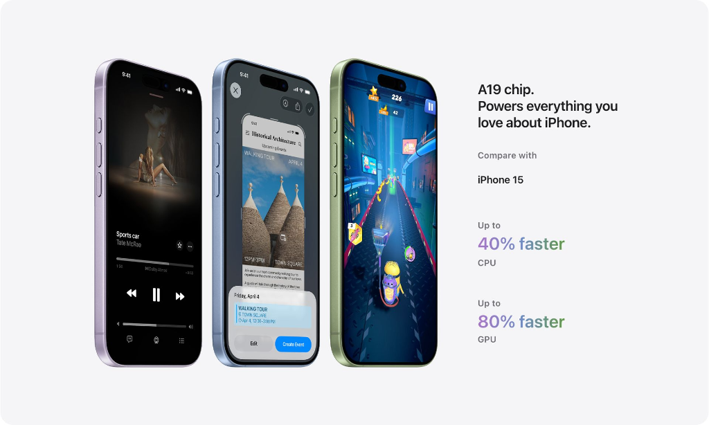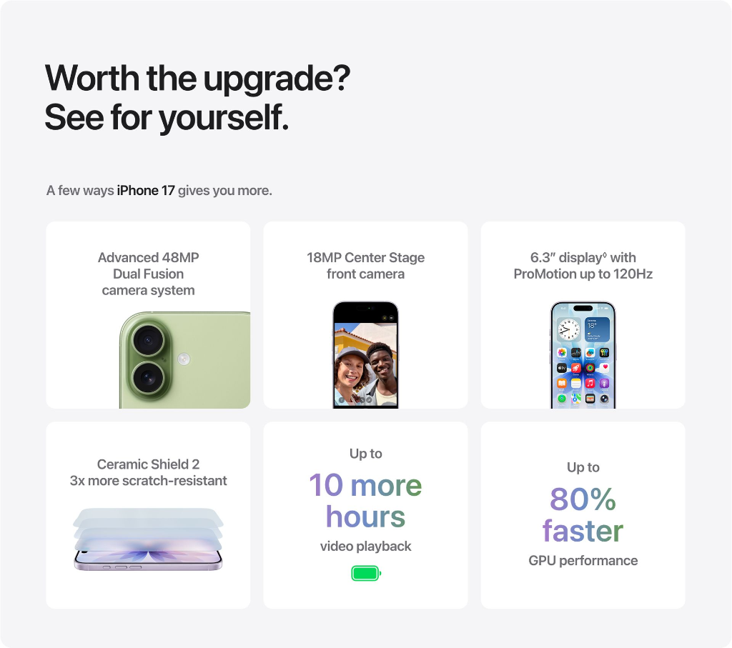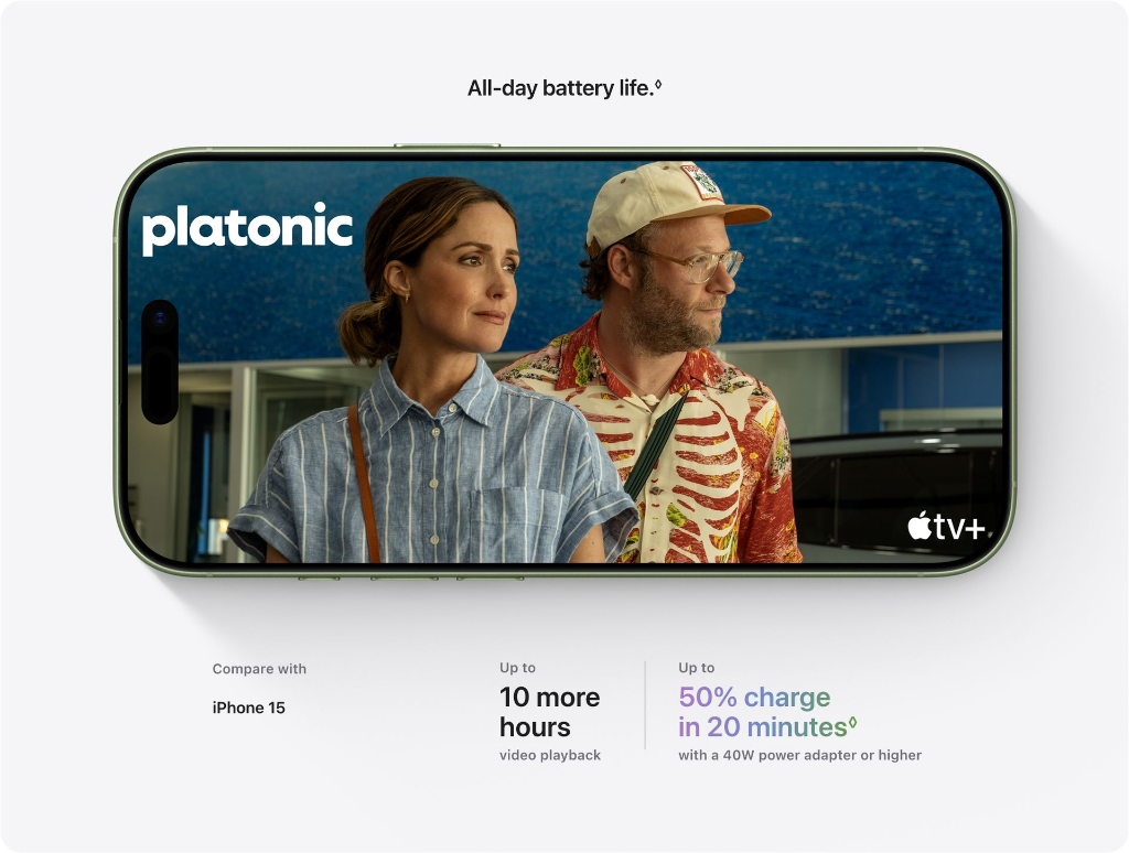 Up to 50% Charge in 20 Minutes: Testing conducted by Apple in July 2025 using preproduction iPhone 17, iPhone Air, iPhone 17 Pro and iPhone 17 Pro Max units and software, USB‑C Charge Cable with Apple 40W Dynamic Power Adapter with 60W Max (Model A3351) and Apple MagSafe Chargers (1‑metre Model A3502 and 2‑metre Model A3503) with Apple 30W USB‑C Power Adapter (Model A2164) or Apple 40W Dynamic Power Adapter with 60W Max (Model A3351). Fast‑charge testing conducted with drained iPhone units. Times measured from the appearance of the Apple logo as the unit started up. Charge time varies with adapter, settings, usage and environmental factors; actual results will vary.