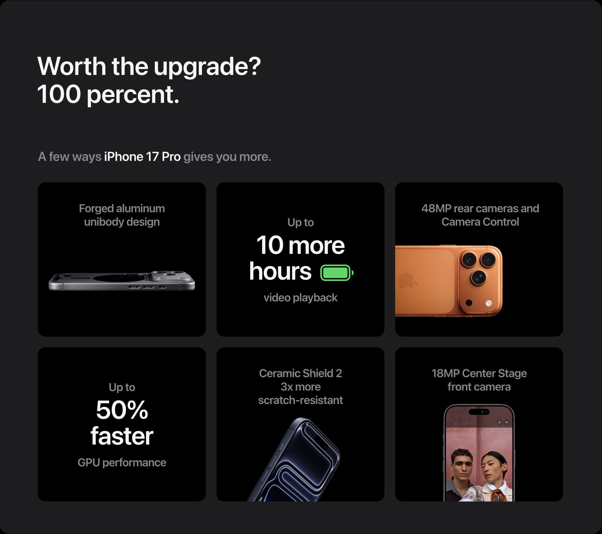 Display Size: The display has rounded corners. When measured as a rectangle, the screen is 6.86 inches (iPhone 17 Pro Max), 6.55 inches (iPhone Air), 6.27 inches (iPhone 17, iPhone 17 Pro) or 6.06 inches (iPhone 16e) diagonally. Actual viewable area is less.